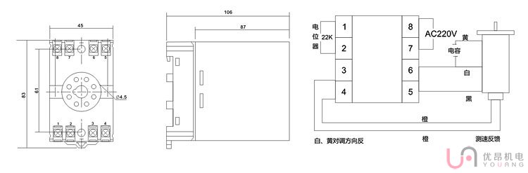 ① 調速馬達(220V) :配合速度控制器可調速范圍廣:90~1400RPM,內部備有轉速傳感器,實行反饋控制,因此電源頻率有變化,其規(guī)定轉數決無變化。