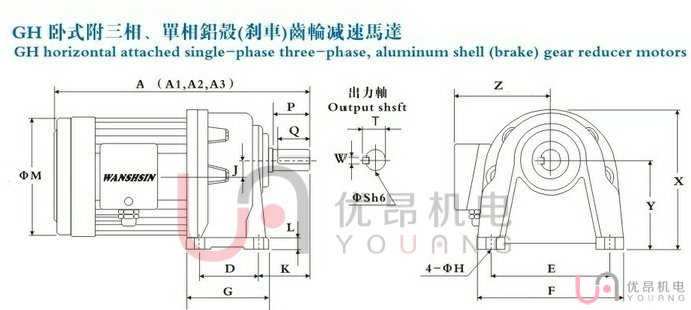 尺寸(mm)A1為三相電機(jī)尺寸,A2為單相電機(jī)尺寸,A3為帶剎車電機(jī)尺寸